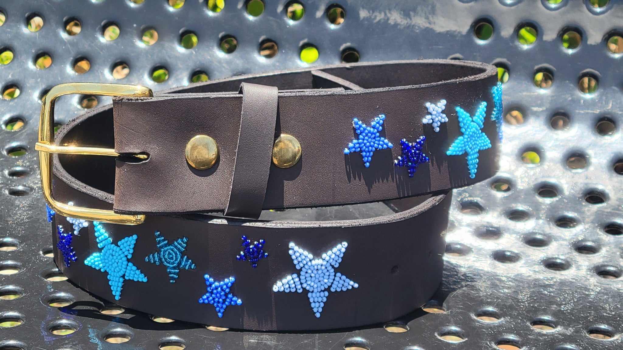 Introducing Indigo Stars Belt - Wide with a width of 1 1/2 inches: Featuring a dazzling star pattern in various brilliant shades of blue, intricately beaded onto rich brown leather. This belt blends celestial elegance with vibrant color, offering a striking accessory that adds a touch of starry sophistication to any outfit. Whether paired with jeans and a T-shirt or used as a bold statement over a tunic or simple dress, it effortlessly elevates your look.