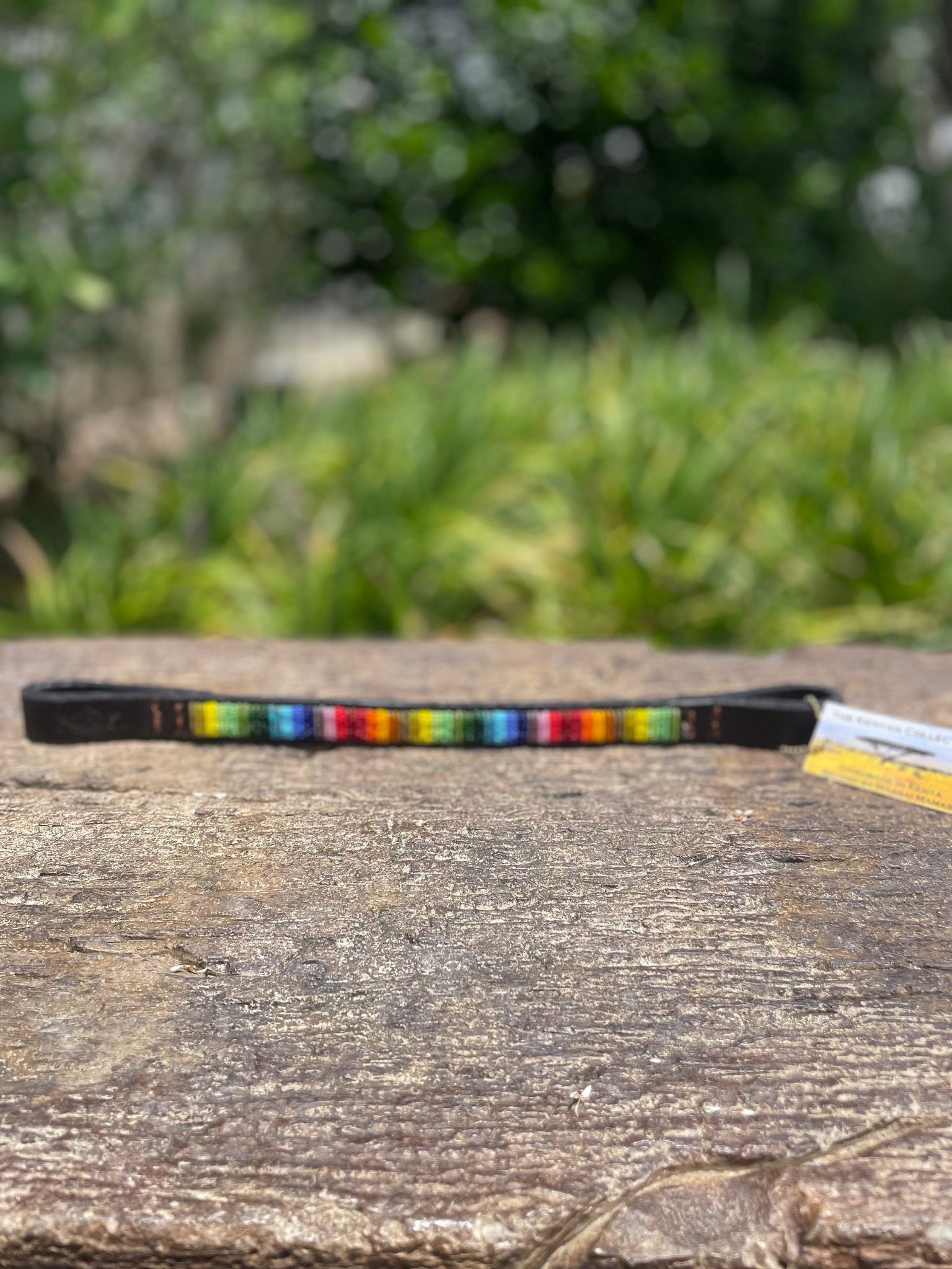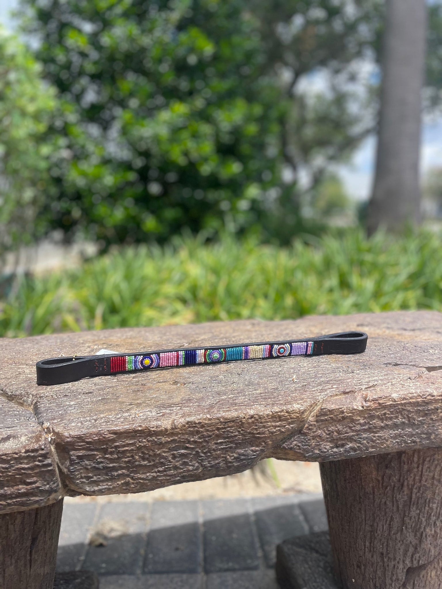 Introducing our exquisite hand-beaded browbands, meticulously crafted by the talented mamas of the Maasai Tribe on durable Black leather. Available in sizes ranging from 14 to 17 inches, these browbands are the epitome of artisanal craftsmanship.